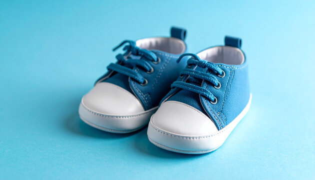 Tiny baby shoes on light blue surface, newborn concept, minimal style