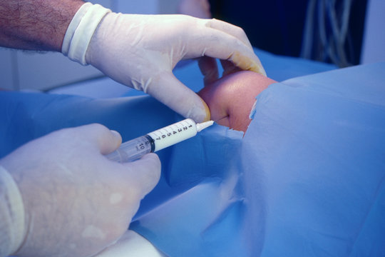 Orthopedic doctor injecting cortisone in slipped disc during infiltration therapy