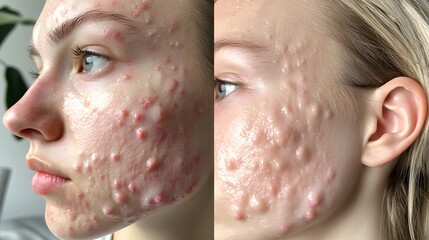 Dual face view  One side with active cystic acne, the other shows healing skin--pustules transforming into smooth, less inflamed spots with closed pores