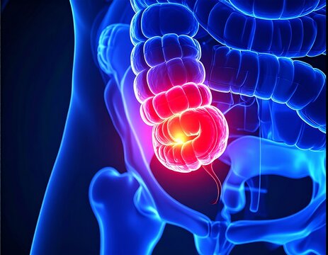 Medical illustration of the human digestive system highlighting a painful, inflamed large intestine, representing a bowel disease or abdominal disorder.