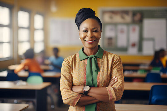 Confident female school teacher in classroom, arms crossed, smiling warmly at students, dedicated educator ready to inspire and motivate young minds in learning environment.