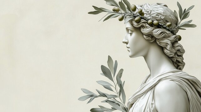 Athena with olive branch Easter crown, wisdom goddess, pale cream background