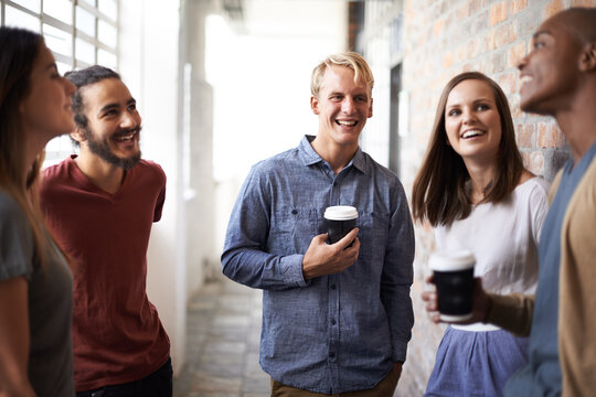 Lighthearted discussion with classmates. Shot of a diverse group of university friends talking in a hallway.