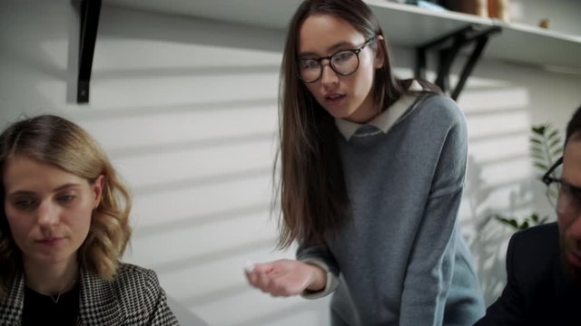 In Creative Office Productive Coworkers Standing at the Table, Company Meeting. Colleagues and clients talking strategy with laptop and tablet.