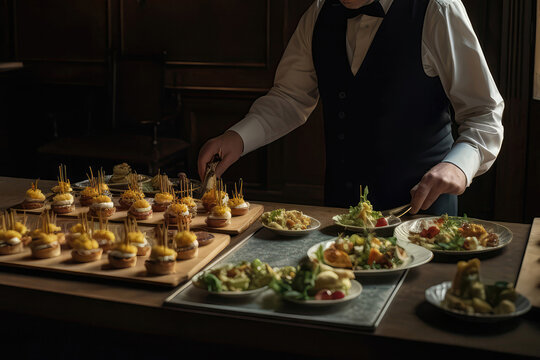 Butler Laying Out Tray Of Canaps For Cocktail Party. Generative AI