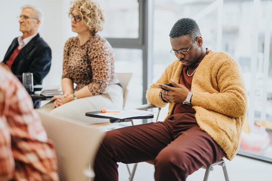 During a dynamic business seminar, professionals connect and share ideas over steaming cups of coffee