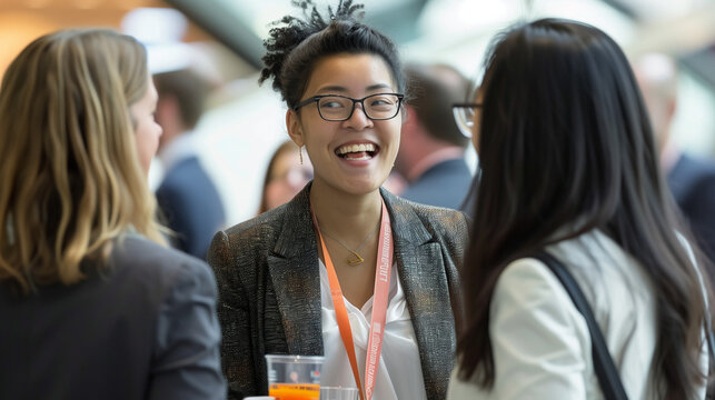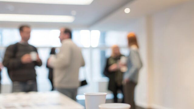 Networking Coffee Break Blur: A casual networking scene with blurred attendees holding coffee cups and engaging in conversations.