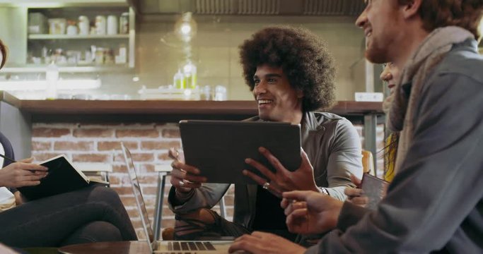 Colleagues and clients talking strategy with laptop and tablet.Group of multiethnic people having informal business team meeting in restaurant lounge.Teamwork,corporate,diversity and social concepts