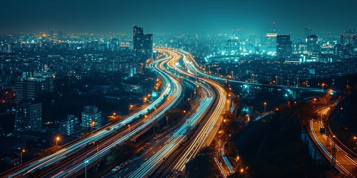 Cityscape Connections: The illuminated web of data transfer intertwining the urban streets on the information highway of the Internet of Things