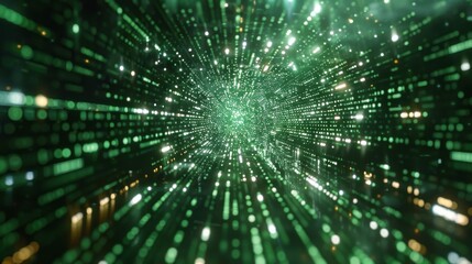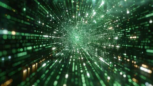 Tunnel of green lights and digital codes. Flow of information through a virtual space. Technology
