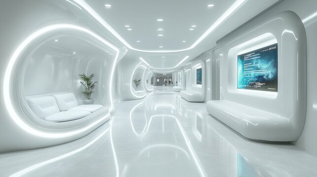 A modern hallway featuring pink-themed artwork and informational displays on the walls.