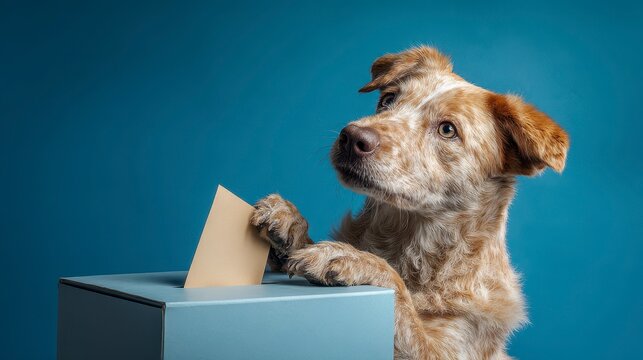 A mixed-breed dog, with reddish-brown and white fur, places a folded paper ballot into a blue ballot box against a blue background