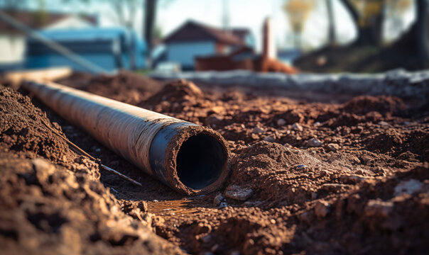A detailed view of a pipes partially buried in the dirt. This image can be used to depict construction, plumbing, or infrastructure projects