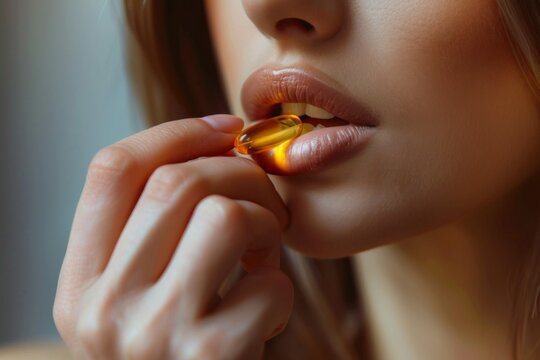 AI generated illustration of a woman holding fish oil capsule, about to ingest it