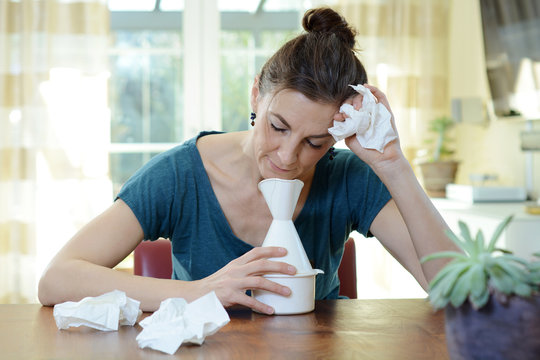 Relaxed woman enjoying steam facial with eyes closed and towel wrapped around head for spa therapy, skin care, detox, wellness, rejuvenation, beauty treatment, and peaceful self-care routine