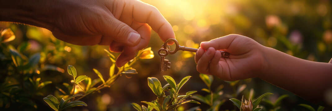 A young child's hand reaches out to receive an ornate, antique key from an adult's hand, symbolizing inheritance