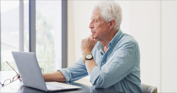 Old man, reading or laptop in home for retirement planning, pension policy or finance management. Elderly person, computer or review with inheritance info, estate preparation and trust fund website.