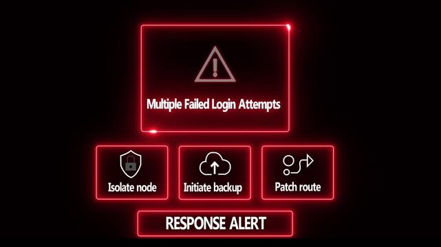 Multiple Failed Login Attempts response notification on digital interface in data center server room with isolate node initiate backup patch route options. glowing neon lights cybersecurity hacking
