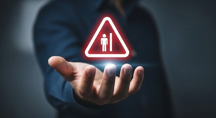 Workplace safety, sensor systems, industrial technology, machine alerts, hazard prevention, operational security. Icon of signal alert on walking person with forklift in background. Workplace safety