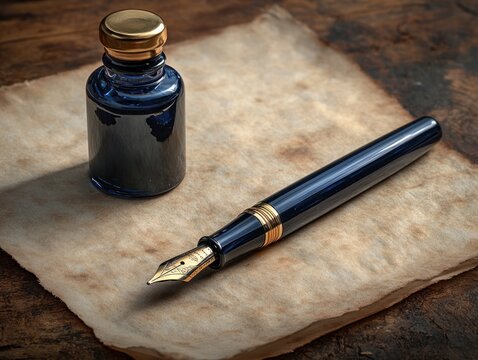 A vintage journal open to handwritten pages, alongside a dark blue ink bottle and fountain pen, bathed in sunlight