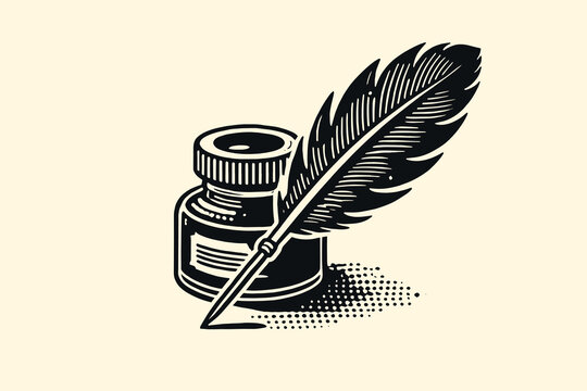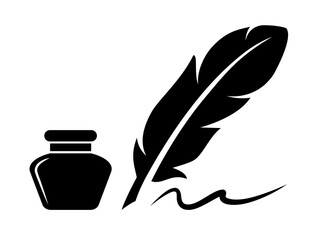 Vintage inkpot and feather illustration, black vector icon or emblem