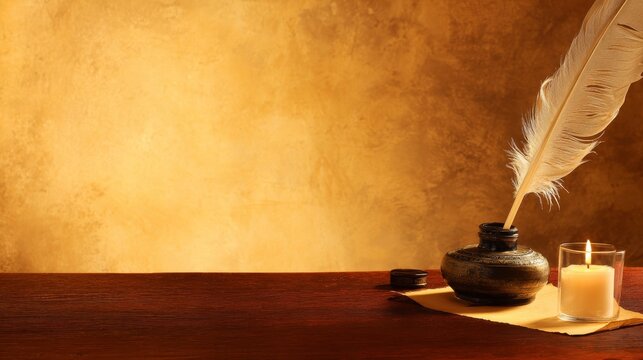 Crispy parchment paper with a quill pen and inkpot signifies timeless writing and historical documentation.