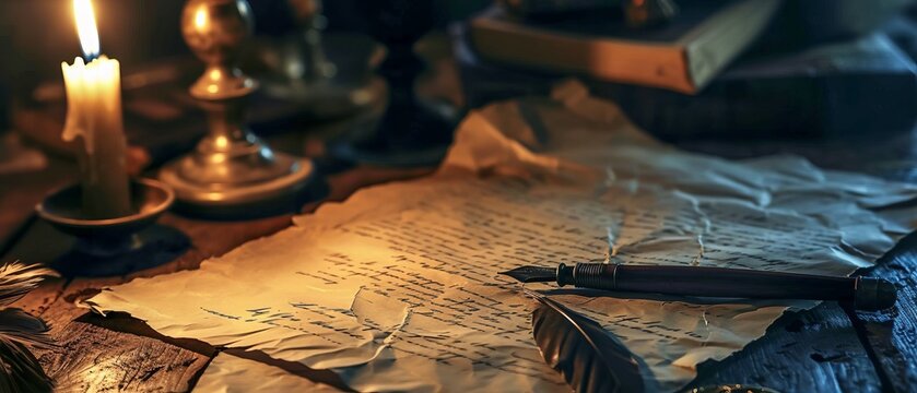 Scrolls with ink bottles, feather quills, open books, vintage writing tools, fantasy stationery, cartoon style, flat vector illustration