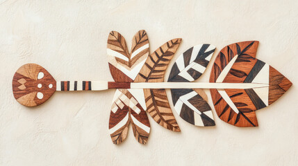 Artisan marquetry folk art piece depicting decorative arrow with multi-toned wood inlay and patterned feather details against neutral wall