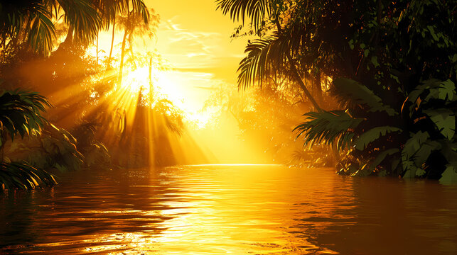 Finding inner peace in a serene jungle stream at sunrise, a silhouette of tranquility reflected in the golden water. Inner Jungle. Illustration