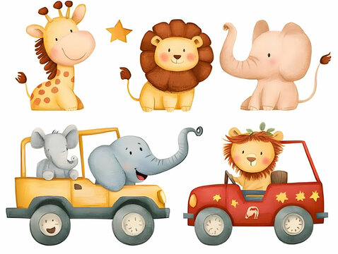 Cute, colorful, cartoonish animals nestled in green grass and foliage with tiny apples on a pale yellow background
