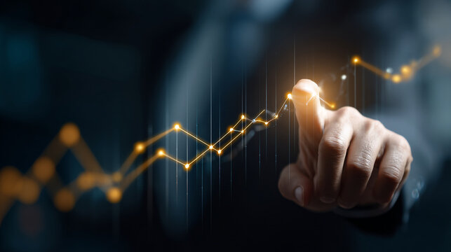 A hand interacts with a glowing line graph showing upward trend on a dark blurred background