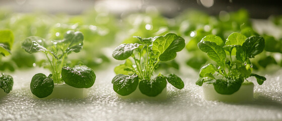Green shoots in white containers under artificial irrigation symbolise innovative agriculture and can serve as an atmospheric backdrop for presentations on the future of farming.
