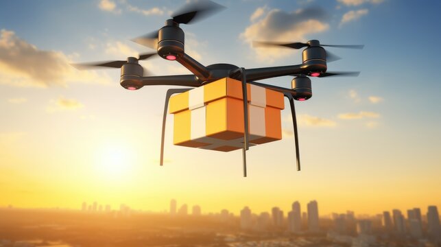 A futuristic drone carries a package over a city skyline at sunset, illustrating innovation in delivery services and technological advancement.