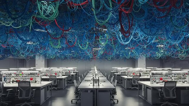 Data Center Server Room with tangled cables and servers, technological infrastructure