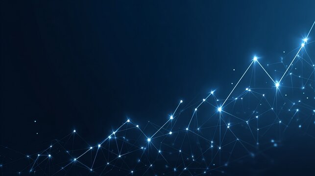 Digital network with glowing nodes forming an upward trending line on blue backdrop