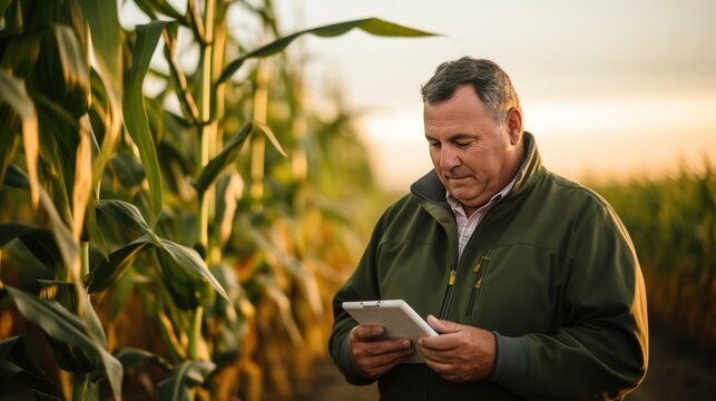 A forward-thinking farmer stands in a lush cornfield, using a digital tablet for advanced crop monitoring and data-driven agriculture practices in a modern, technology-enhanced rural setting