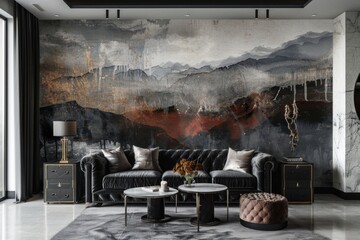 an article showcasing the innovative use of modern interior design elements against the backdrop of a dark classic wall. Highlight how the juxtaposition of sleek, upholstered furniture