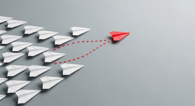 A red paper airplane leads a group of white paper planes on a gray backdrop, symbolizing leadership and innovative strategic direction.