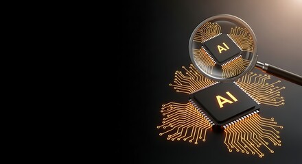 Intelligent AI chip circuitry analyzed by magnifying glass, symbolizing innovation and advanced technology research