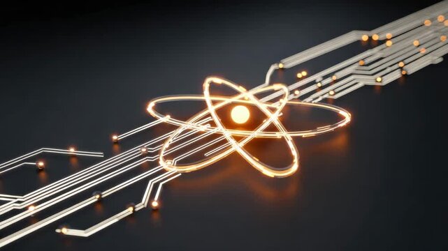 An artistic representation of an atom interconnected with circuitry, symbolizing technological advancements