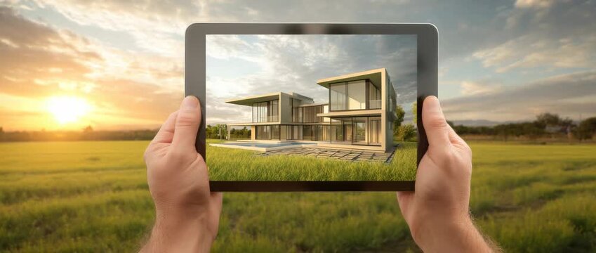 A persons hand holds a smartphone capturing a virtual display of a modern home, blending with the surrounding environment.