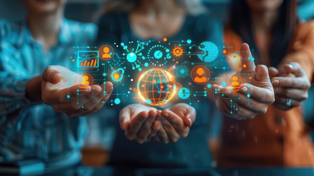 Businesswomen collaboratively shaping the future with their hands holding innovative icons representing teamwork, strategy, and achievement