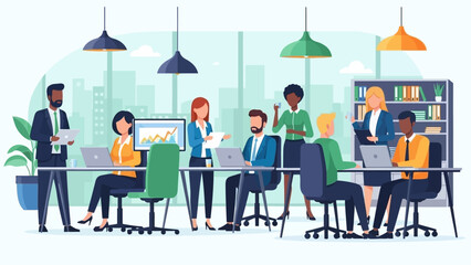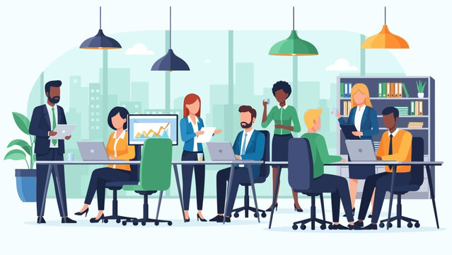 Diverse corporate team collaborating in a business meeting. Brainstorming innovative ideas and strategies for project growth. Teamwork and data analysis concept. Vector illustration.