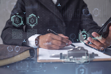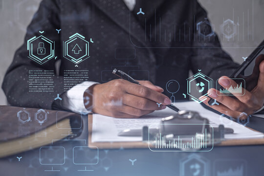 African American businesswoman is signing the contract to create a start up for the conference and gain investments for innovative service. Checking the details at smartphone. Hologram tech graphs.