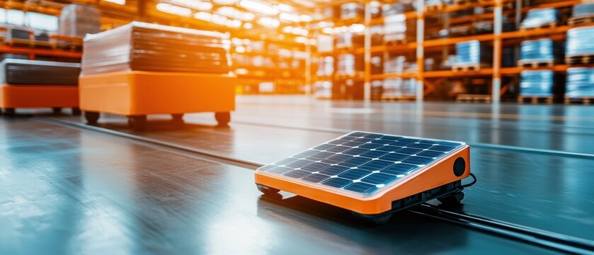 A solar-powered robot cart navigates a warehouse, showcasing advanced technology and automation in logistics and storage solutions.