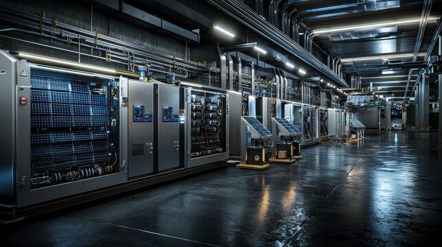 Modern solar-powered vehicles lined up on a factory assembly line, showcasing advanced technology and sustainable transport solutions.