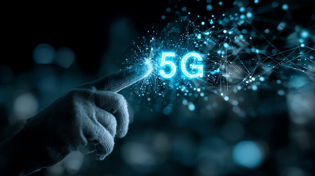 Close-up of a hand touching a glowing 5G symbol, representing innovation and advanced communication technology.