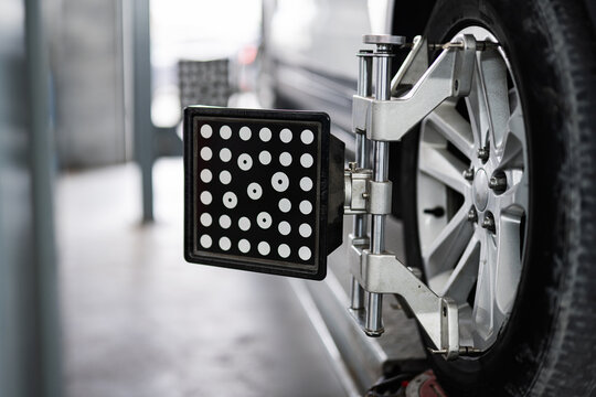 Close-up of a car wheel alignment process using advanced equipment in an automotive repair shop. Precise calibration for optimal vehicle performance.