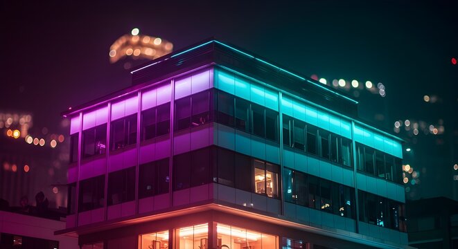 Modern office building glows with vibrant neon lights at night, perfect for tech startup branding, creative agency visuals, or innovative corporate designs creating a futuristic vibe