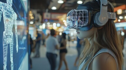 Woman engaging with virtual reality at tech innovation fair